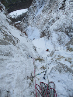 Pour cette première, les conditions se seront avérées viriles. Le début du couloir est une pente de neige qui se redresse progressivement jusqu'à 45 ou 50°. Hier, cela nous aura bien fait galérer avec un brassage en règle jusqu'à la taille. Bien entendu, nous avions négligé de prendre les Arva, restés au chaud dans la voiture (les conneries ne sont pas un privilège des jeunes...). La suite s’avérera très sympa avec une longueur en 80° assez fine et un court passage plus délicat sur le haut dans un dièdre dalleux. La sensation de froid ne nous lâchera pas de la journée au point que Fabrice se fera une petite frayeur, certains de ses doigts de pied étant devenus insensibles.